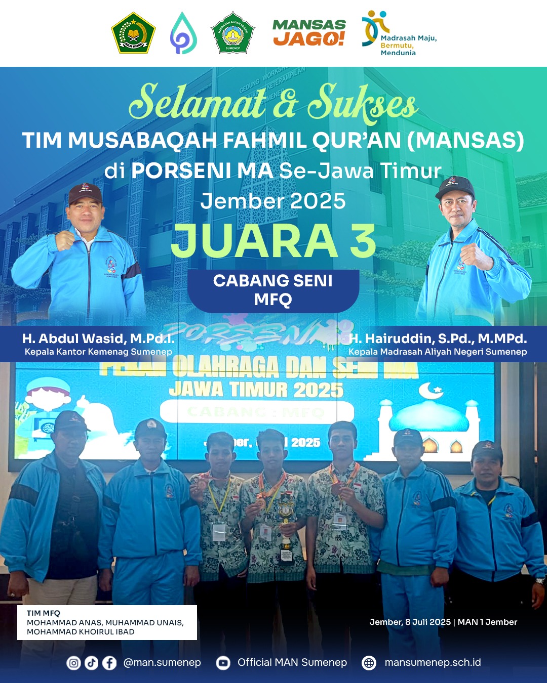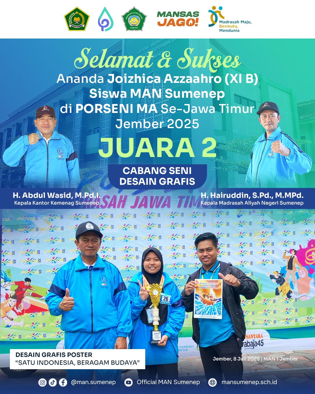 Para peserta dari MAN Sumenep menunjukkan performa maksimal di tengah persaingan ketat antar-madrasah dari seluruh Jawa Timur. Dua medali tersebut diraih dalam cabang Musabaqah Fahmil Quran (MFQ) oleh Mohammad Anas (X-A), Mohammad Unais (X-A), Mohammad Khoirul Ibad (X-A), dan Desain Grafis Poster “Satu Indonesia, Beragam Budaya” atas nama siswi Joizhica Azzaahro (XI-B), dua bidang yang sama-sama menuntut konsentrasi, ketangguhan, dan dedikasi tinggi.