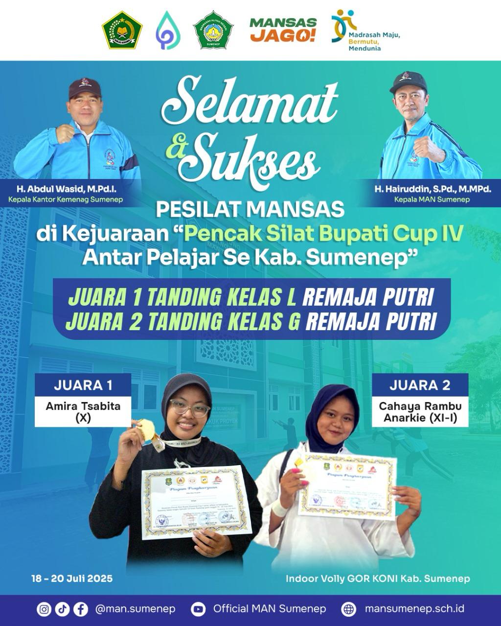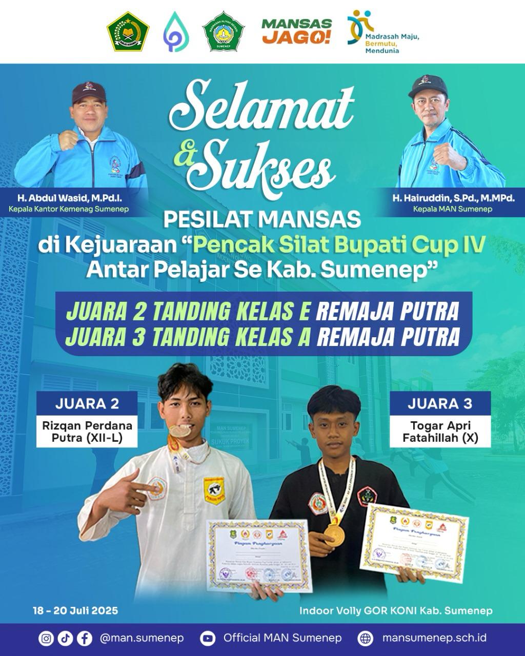 MAN Sumenep - Jurnalistik - Pesilat MANSAS JAGO mengukir sejarah gemilang di dunia persilatan. Dengan performa yang luar biasa, tim pencak silat MAN Sumenep berhasil menyabet quintrick gelar atau lima gelar juara sekaligus, dalam Kejuaraan Pencak Silat Bupati Sumenep Cup IV 2025, pada Minggu (20/7/2025) di GOR A. Yani Sumenep. Ajang pencak silat tahunan yang diselenggarakan oleh Perguruan Silat Nasional (PSN) Perisai Putih Cabang Sumenep ini, diikuti ratusan atlet pelajar muda dari berbagai sekolah di Kabupaten Sumenep. Prestasi ini menegaskan dominasi mereka yang tak terbantahkan di kancah pencak silat tingkat kabupaten. "Kami sangat bangga dengan pencapaian ini. Ini adalah hasil kerja keras, disiplin, dan dedikasi tinggi dari seluruh atlet, pelatih, serta dukungan penuh dari pihak madrasah dan orang tua," ujar Kepala MAN Sumenep, H. Hairuddin, S.Pd., M.M.Pd., dengan wajah sumringah. Beliau juga menambahkan bahwa ini adalah bukti nyata pembinaan yang berkelanjutan di MAN Sumenep.