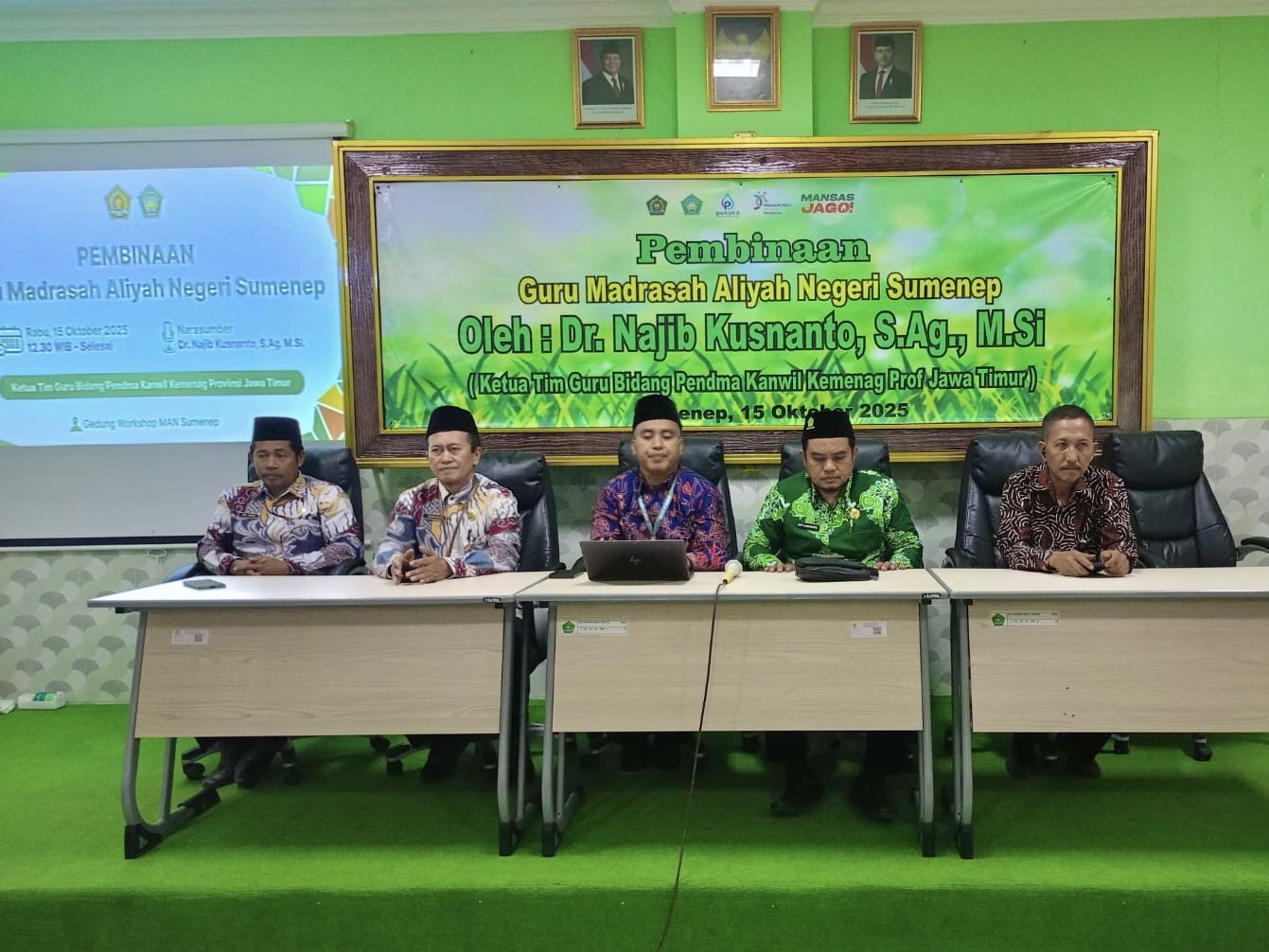 MAN Sumenep – Jurnalistik - Madrasah Aliyah Negeri Sumenep menunjukkan keseriusannya dalam mempertahankan dan meningkatkan kualitas pendidikan. Baru-baru ini, MAN Sumenep menggelar pembinaan intensif bagi seluruh pengajar, dengan menghadirkan narasumber utama yang sangat kompeten: Ketua Tim Guru Bidang Pendidikan Madrasah (Pendma) Kanwil Kementerian Agama (Kemenag) Provinsi Jawa Timur. Langkah strategis ini bertujuan untuk menyelaraskan mutu pendidikan madrasah. Pembinaan yang dilaksanakan di Gedung Workshop MAN Sumenep, Rabu (15/10/2025).