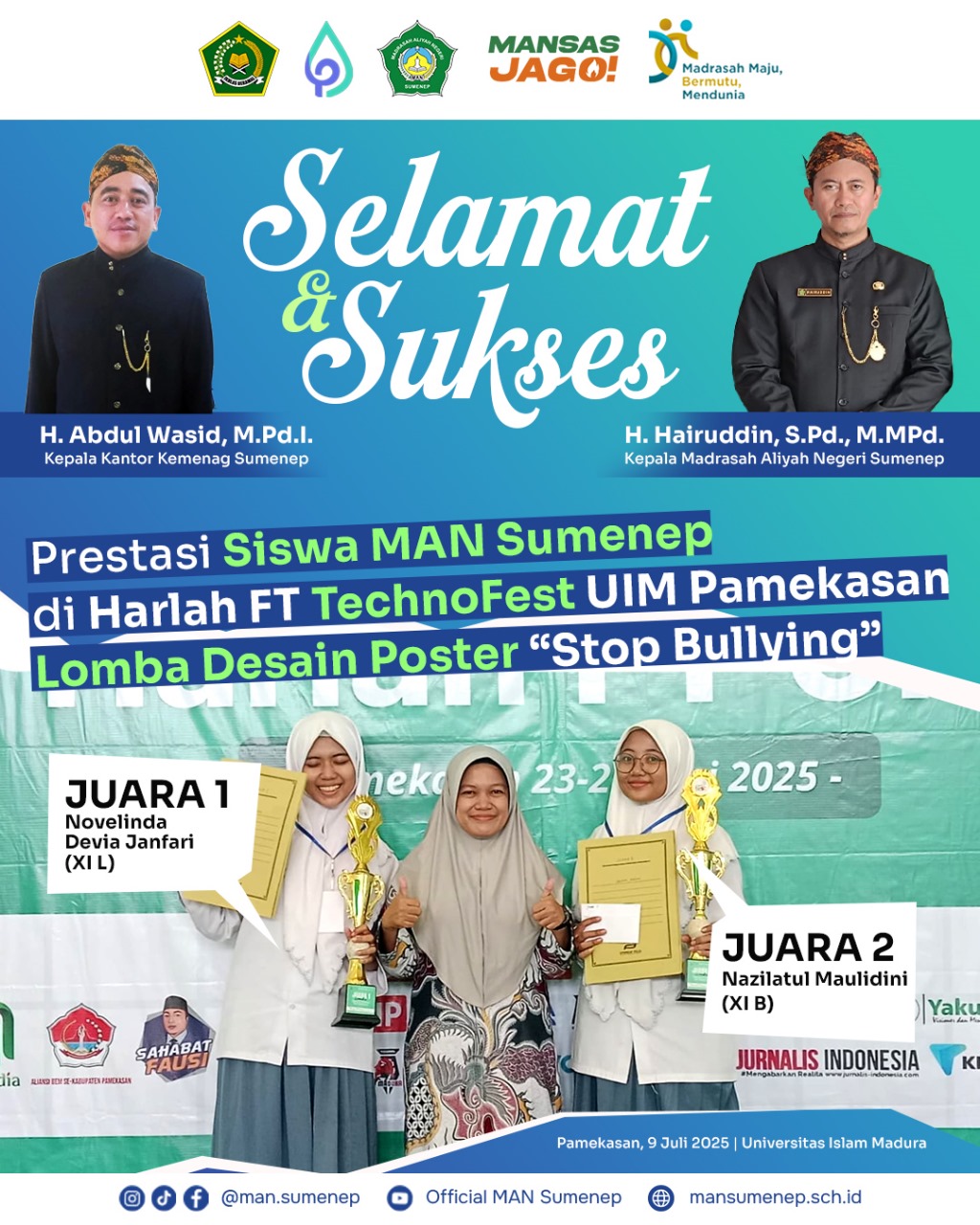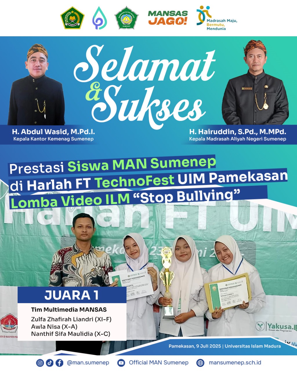 MAN Sumenep - Jurnalistik - Kabar membanggakan kembali datang dari dunia pendidikan madrasah. MAN Sumenep sukses memborong dua gelar bergengsi sekaligus dalam ajang lomba videografi dan desain poster tingkat Madura yang diselenggarakan oleh Fakultas Teknik Universitas Islam Madura (09/07/2025). Tidak tanggung-tanggung, madrasah ini berhasil menyabet Juara 1 pada dua cabang lomba sekaligus, membuktikan bahwa madrasah kini tak hanya unggul dalam akademik dan keagamaan, tetapi juga di panggung kreativitas visual.